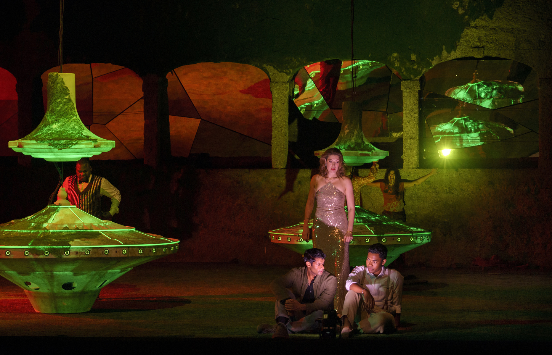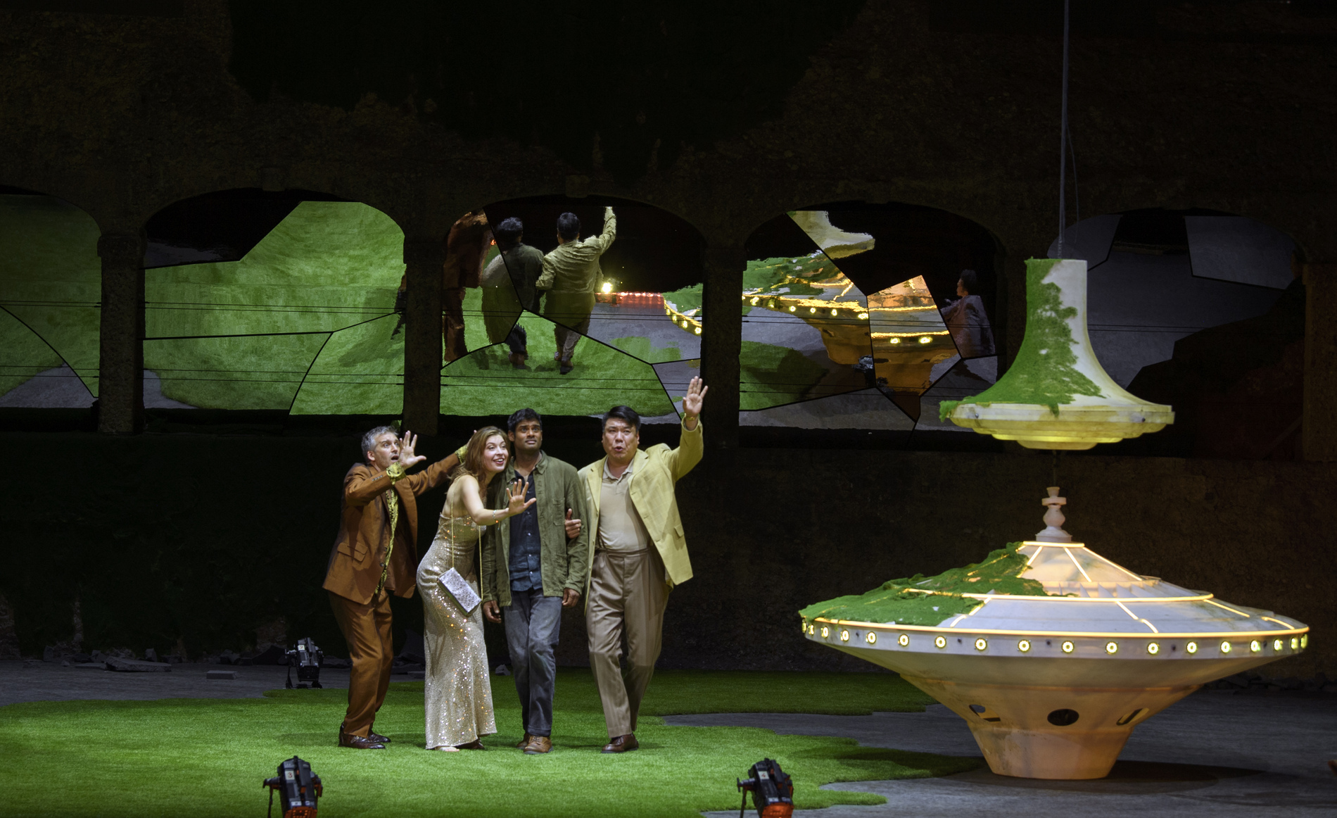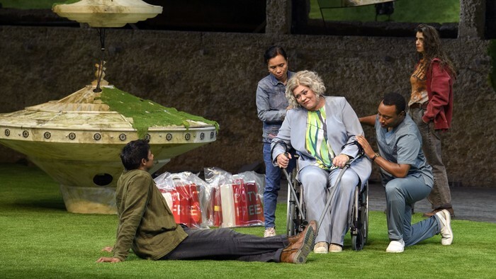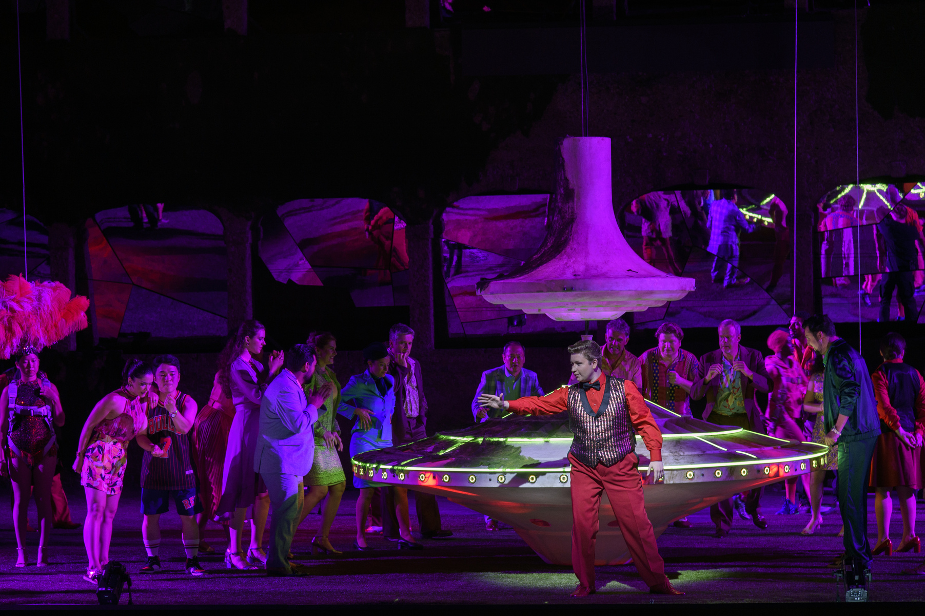 Прокофьев упростил и оптимизировал сюжет «Игрока» Достоевского, сократив количество актёров до десяти, а Питер Селларс, удивительно эффектно обыграв специфическое пространство зальцбургской сцены Фельзенрайтшуле, осовременил и политизировал события. Сотовые телефоны, электронные письма, экопротесты и морализаторство, осуждающее капитализм, – и всё это на фоне настоящего светового шоу с огромными рулетками, взмывающими в воздух, как НЛО. Кто из персонажей – тот самый Игрок? Возможно, отставной Генерал в исполнении китайского баса Пэйсинь Чэня или его родственница Бабуленька (Виолета Урмана). Или учитель генеральских детей Алексей (Шон Паниккар). Или она – роковая женщина Полина – блестящая литовская сопрано Асмик Григорян?